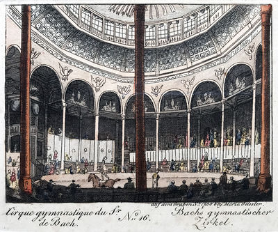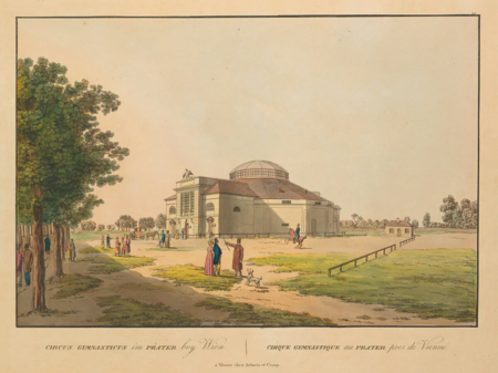 The Circus Gymnasticus (Gymnastischer Zirkel, later known as Circus im Prater) was one of the earliest permanent circuses built in continental Europe. It had been designed by the fashionable Austrian architect Joseph Kornhäusel for the Latvian equestrian Christoph de Bach (1768-1834), who had settled in Austria around 1805. The Circus Gymnasticus’s elegant building was erected in 1808 on the Prater—the old Imperial hunting ground that had become Vienna’s favorite park, and a focal point for fairgrounds amusements.