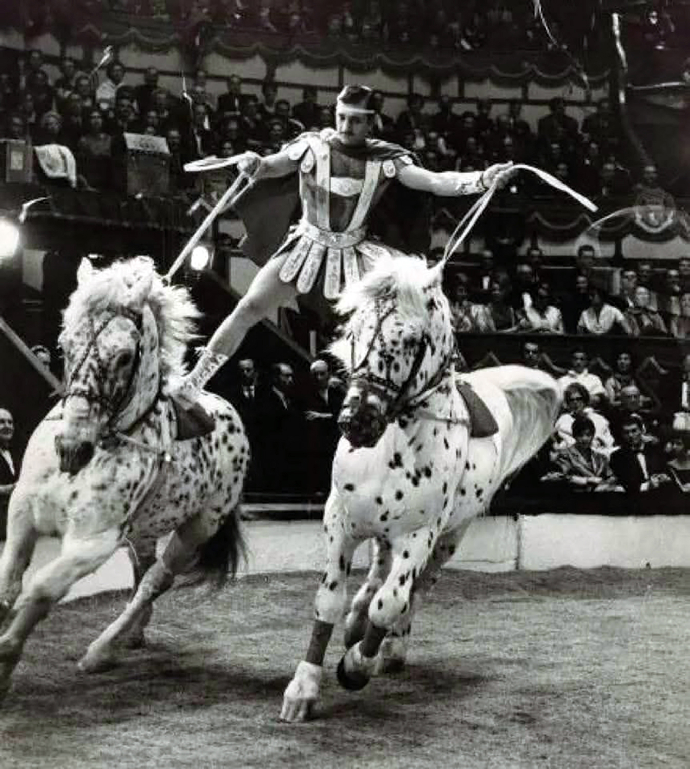 Émilien Bouglione in La Poste ("The CourierAn equestrian presentation created by Andrew Ducrow in 1827 as ''The Courier of St. Petersburg'', in which a rider stands on two galloping horses, one foot on each, and allows other horses to pass between his mounts, catching their reins as they pass, eventually holding the reins a group of galloping horses in front of him. (Also known in French as ''La Poste''.)") performing in the Gala de La Piste at the Cirque d'Hiver (1962) — Photo X