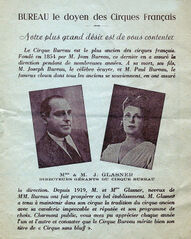 Jules and Anna Glasner on the opening page of the Cirque Bureau's 1948 program. The text reads: "Cirque Bureau is the oldest of French circuses. Founded in 1854 by Mr. Jean Bureau, who has manged it for many years. After his death, his sons, Mr. Joseph Bureau, the famous equestrian, and Mr. Paul Bureau, the famous clown that all the elders remember, continued to manage it. Since 1919, Mr. and Mrs. Glasner, nephews of the Messrs. Bureau, have made this fine establishment prosper. Mr. Glasner has insisted on preserving the tradition of the old circus in his own, with its impeccable and renowned cavalerie(French) The ensemble of the horses in an equestrian circus; a group of horses presented "at liberty." and carefully selected program. Dear audience, each year you have been able to appreciate both, and to see that Cirque Bureau truly deserves its title as the "Circus without bluff."(1948) — Document: BnF/Gallica - Bibliothèque nationale de France