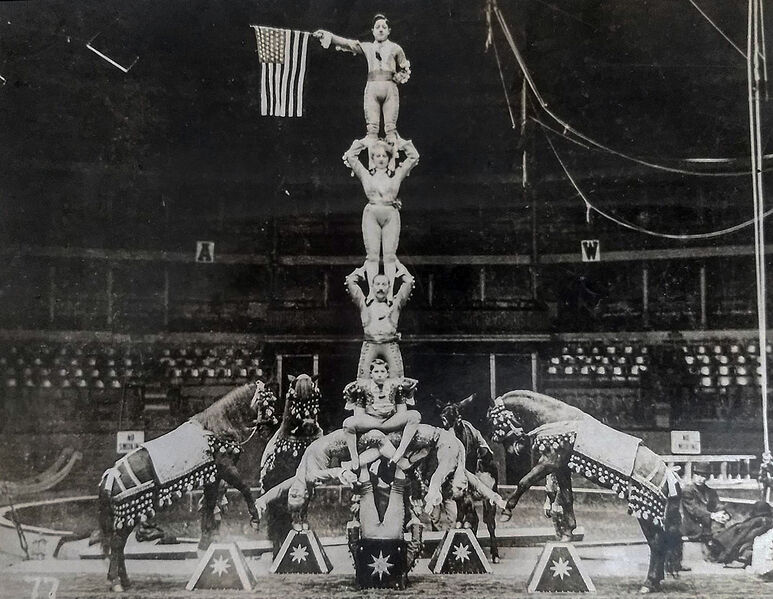 The Lorch Family, posing in their trademark pyramid in an arena when on tour in America with Ringling Bros. Circus (c.1910) — Document: Lorch Family