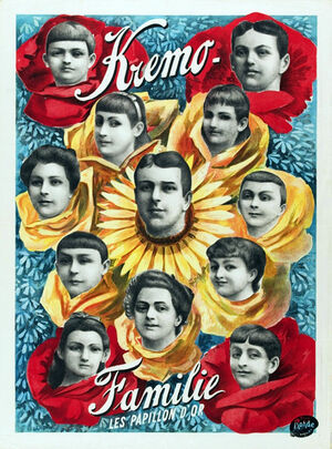 | − | The original Kremo troupe was created around 1880 by Josef Kremo (1854-1917), whose real name name was Kremka. His family was of Czech origins—at a time when Czechoslovakia was part of the Austro-Hungarian Empire. By age ten, Josef Kremka had been apprenticed to the [[The Scheffers|Scheffers]], an Austrian family of talented acrobats who performed the best and most celebrated Risley act of the late 19th century. (Their name's correct spelling was ''Schäffer'', but was generally spelled ''Scheffer'' in the circus and variety business) | + | [[File:The_Kremo_Family.jpeg|thumb|left|300px|Poster for the Kremo Family Troupe]]The original Kremo troupe was created around 1880 by Josef Kremo (1854-1917), whose real name name was Kremka. His family was of Czech origins—at a time when Czechoslovakia was part of the Austro-Hungarian Empire. By age ten, Josef Kremka had been apprenticed to the [[The Scheffers|Scheffers]], an Austrian family of talented acrobats who performed the best and most celebrated Risley act of the late 19th century. (Their name's correct spelling was ''Schäffer'', but was generally spelled ''Scheffer'' in the circus and variety business) |