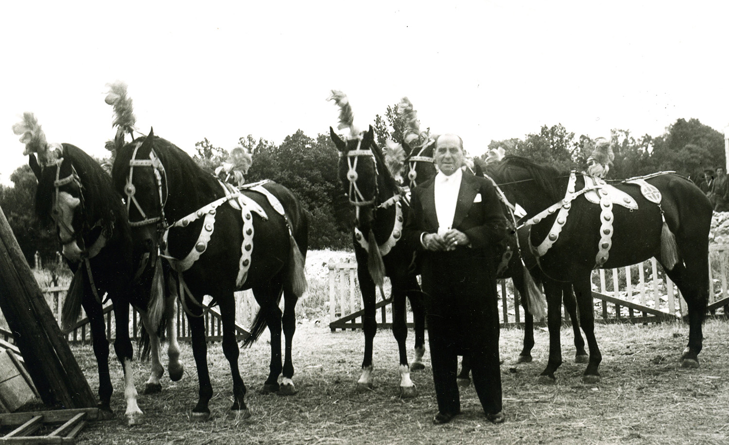 Jules Glasner and his cavalerie(French) The ensemble of the horses in an equestrian circus; a group of horses presented "at liberty." (1946) — Musée du Cirque Alain Frère