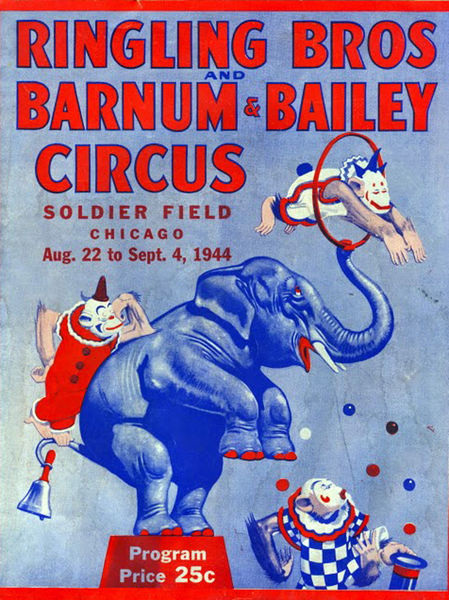 Ringling Bros. and Barnum & Bailey program cover at Soldier Field in Chicago. After the disastrous Hartford, Connecticut, fire of July 6, 1944, the Ringling show played without a big topThe circus tent. America: The main tent of a traveling circus, where the show is performed, as opposed to the other tops. (French, Russian: Chapiteau) at Chicago's Soldier Field stadium. There, the circus faced the notorious Chicago politics and corruption; the Chicago Park Board, which controlled Soldier Field, charged an extra 55¢ on all reserved seat passes, which went into its coffers. In addition, it controlled the concessions (the circus's candy butchers were not allowed in the stadium), and published its own sixteen-page program, whose cover is shown here. (1944) — Document: Eric Beheim Collection