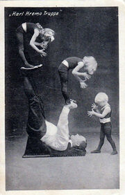 | 03:07, 28 April 2026 | Karl Kremo Children.jpg (file) | 856 KB | Promotional postcard for the early Karl Kremo Troupe: Karl on the ''trinka'', and his children Bellona, Bianca, and Béla (from left to right) (c.1920) — ''Circopedia Archive'' | 1 | |